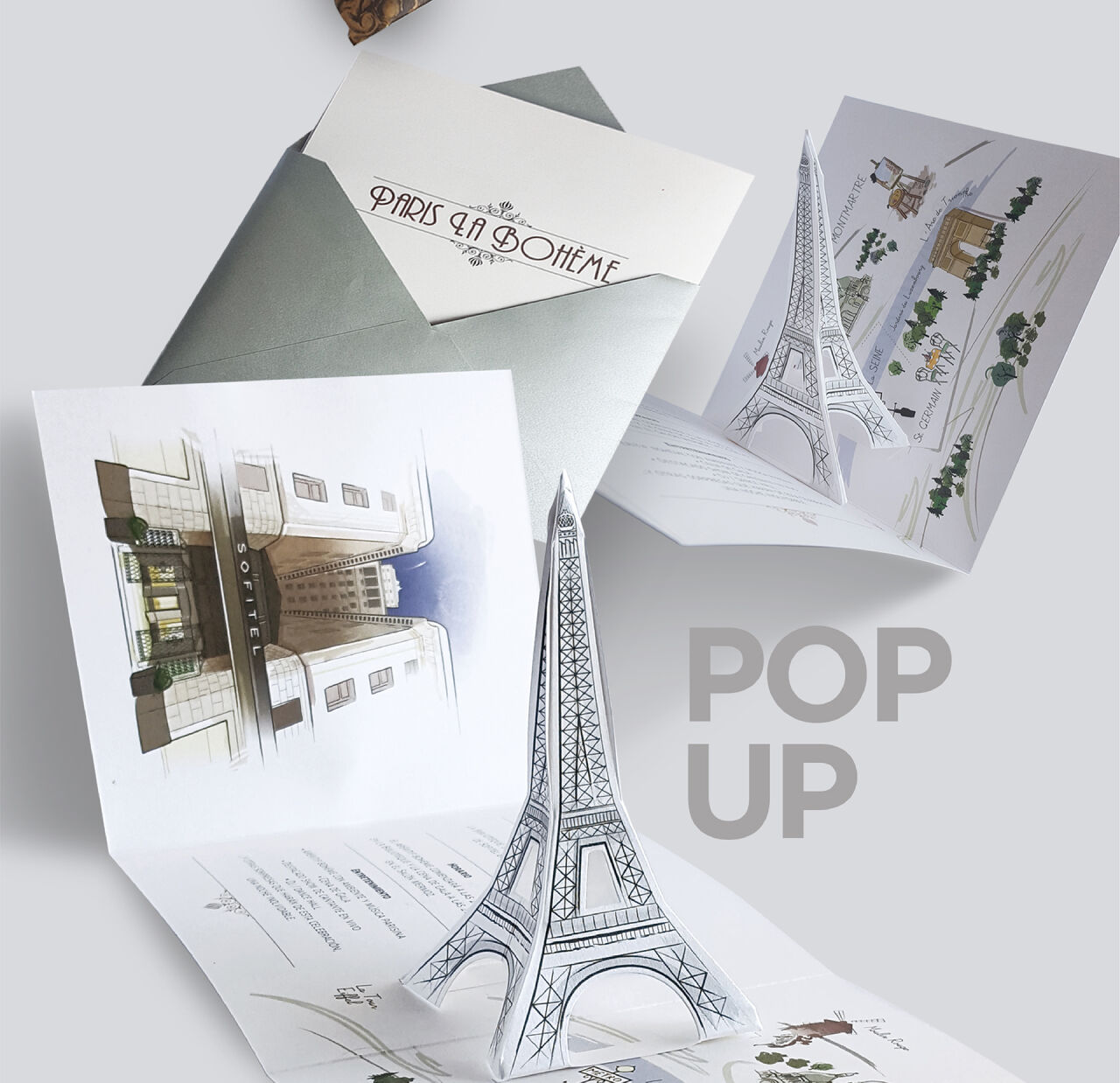 Entre las piezas realizadas se destacaban Invitaciones, flyers troquelados, piezas Pop Up despleglables en 3D, menús, afiches etc.