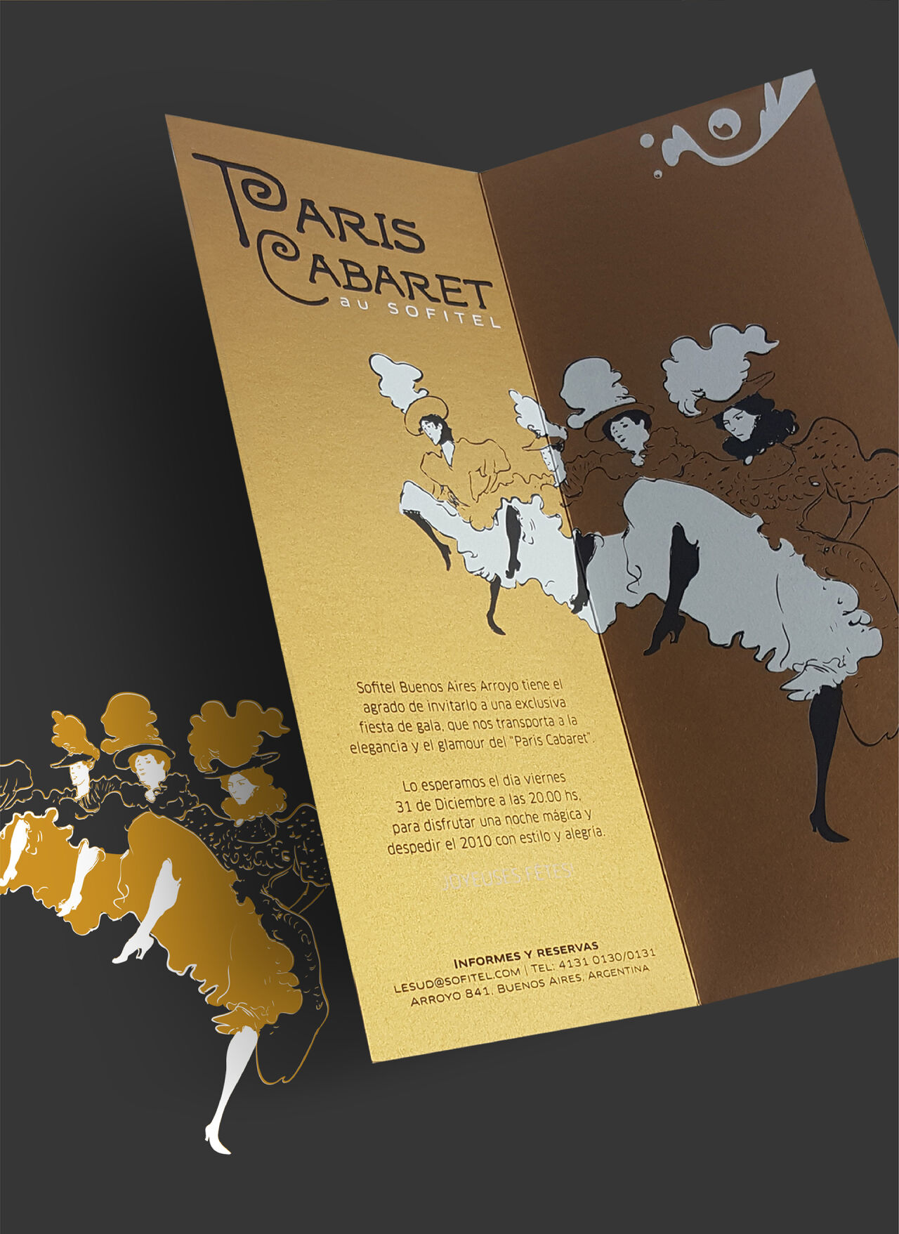 Logramos realizar múltiples piezas gráficas con materialidades y técnicas mixtas trasmitiendo la escencia del evento, utilizando papeles especiales, impresos en serigrafía, tintas metalizadas, sacabocados y recursos que destacaban las distintas temáticas propuestas. "Nuit de Lumière", "Paris L'Artiste", "Paris la Bohème" y "Paris Cabaret" fueron algunas de ellas.